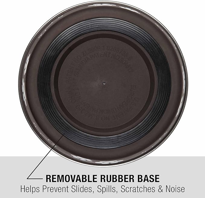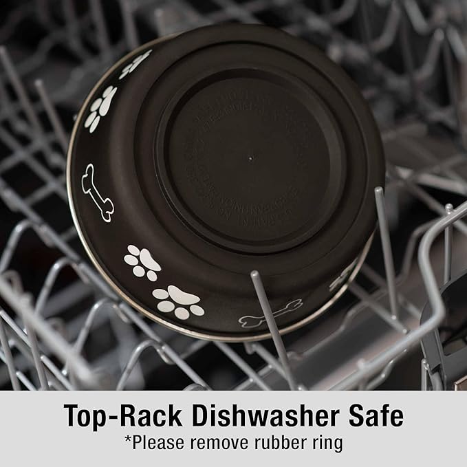 - Veterinarian recommended stainless steel interior. Removable soy-based rubber ring prevents spills and reduces noise. Dishwasher safe; remove rubber ring before washing. Available in five colors and 4 sizes to fit any decor1-Quart bowl