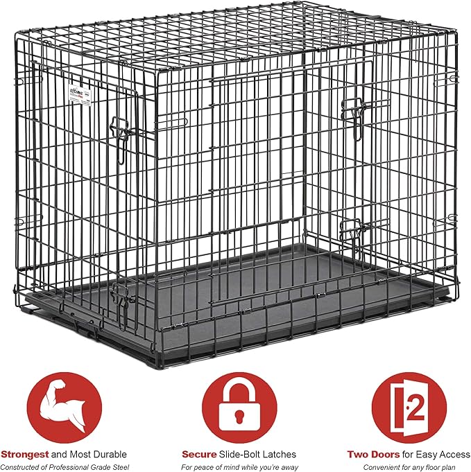 - Convenient double door (front & right side) dog crate configuration with two slide-bolt latches per door securely locking doors in place