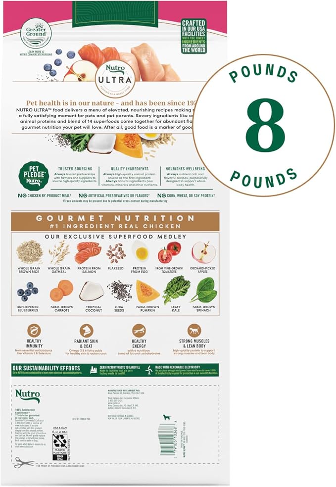 - Contains one (1) 8 lb. Bag of Nutro Ultra Adult Small Breed High Protein Dry Dog Food with a Trio of Proteins from Chicken, Lamb and Salmon.