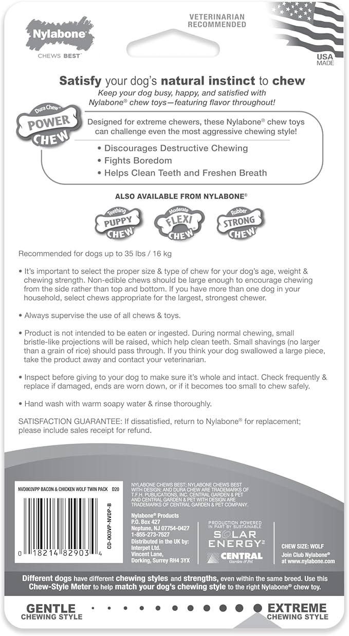 Nylabone Power Chew Classic Bone Chew Toy for Dogs, Durable Dog Toys for Aggressive Chewers, Bacon & Chicken Flavor, Medium/Wolf (2 Count)