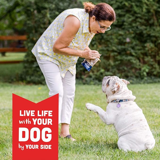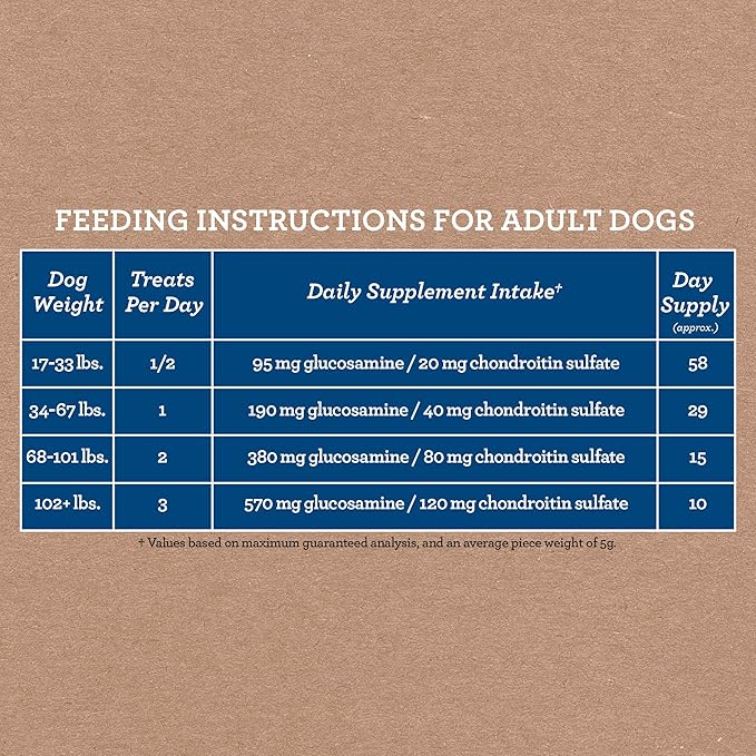 - Soft-textured treats with a daily measured dose of supplementation for your dog’s weight