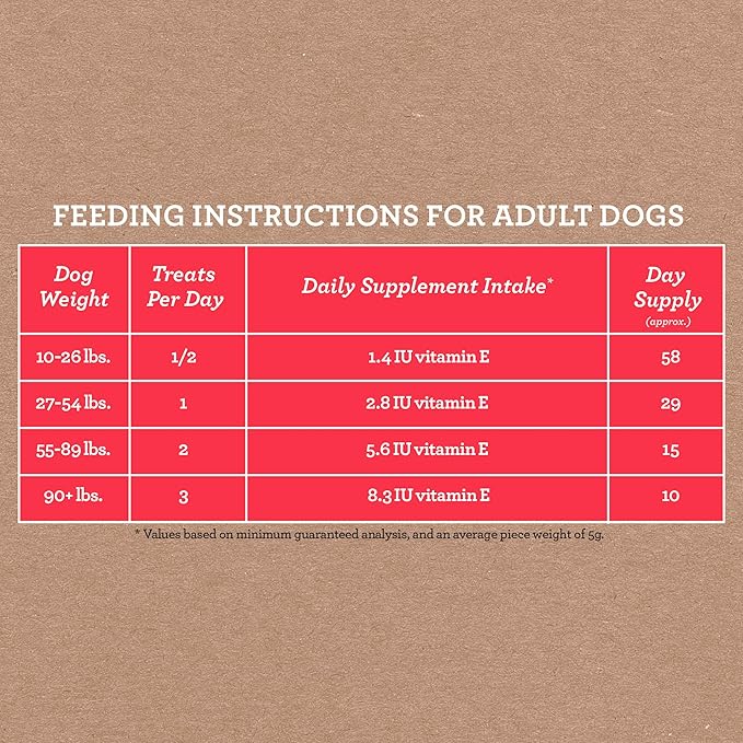 - Soft-textured treats with a daily measured dose of supplementation for your dog’s weight