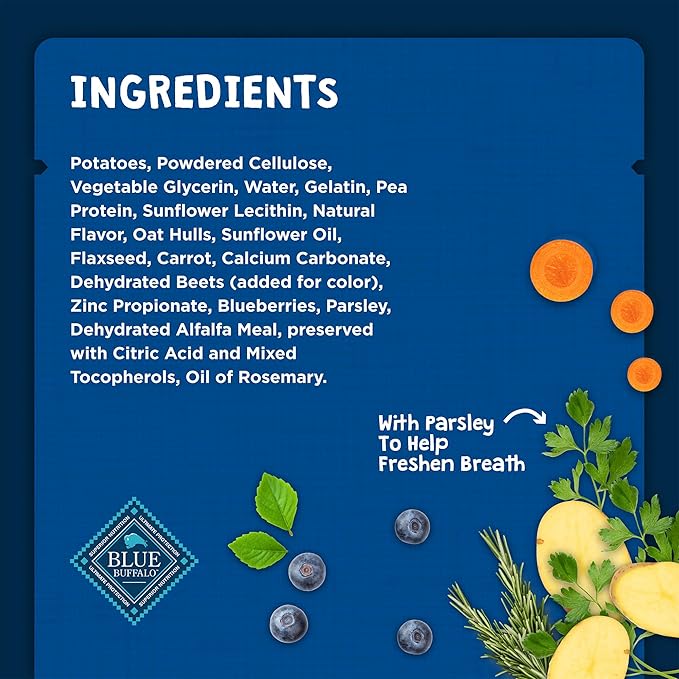 - HEALTHY, WHOLESOME INGREDIENTS: Blue Buffalo dog treats contain no chicken (or poultry) by-product meals, and they are free from corn, wheat, and soy