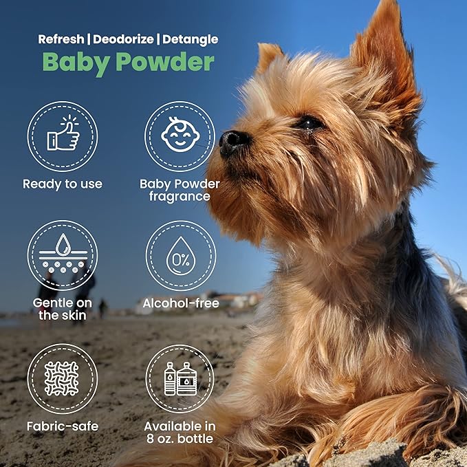 - Baby Powder Essence: Our botanical body splash combines organic chamomile, ginseng, rosemary, rose hips, and sage extracts to give your pet a warm, refreshing, and spa-inspired experience after every shower.