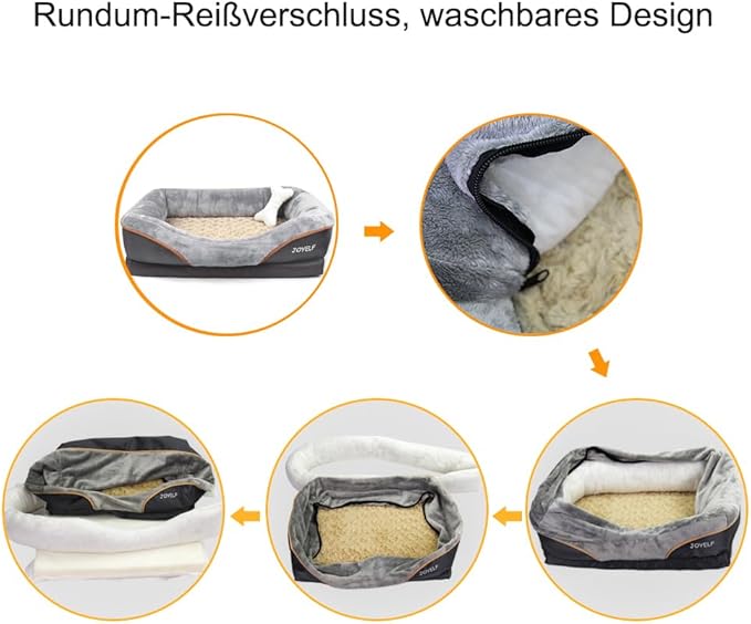 - BETTER DESIGN:①The base high-density memory foam can provide the ultimate sleep experience with superior overall comfort and to last;②The bottom is lined with to avoid the bed from ever sliding around;③Soft & Full comfy PPcotton-padded Bolsters (couch arms) surround a whole circle can protect your pet's neck.④The hidden zipper of this orthopedic dog bed makes the product look better;⑤Internal liner to protect memory foam from liquids.