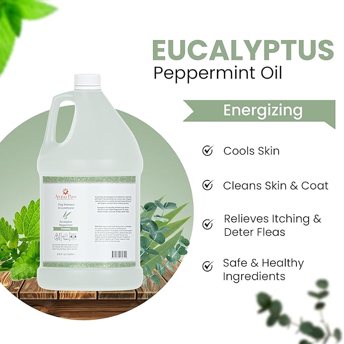 - Energizing Dog Shampoo: Contains eucalyptus oil to naturally refresh and clean the skin and coat, and indian peppermint oil to help relieve itchy skin