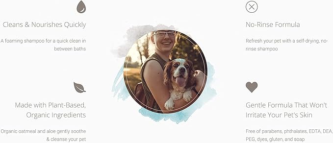 - WATERLESS, NO RINSE FORMULA: We created a no rinse dog shampoo formula to help make it easy and simple to give your pup a quick clean. This foaming cleanser requires no water, no rinsing, and is a self-drying, natural shampoo for dogs.