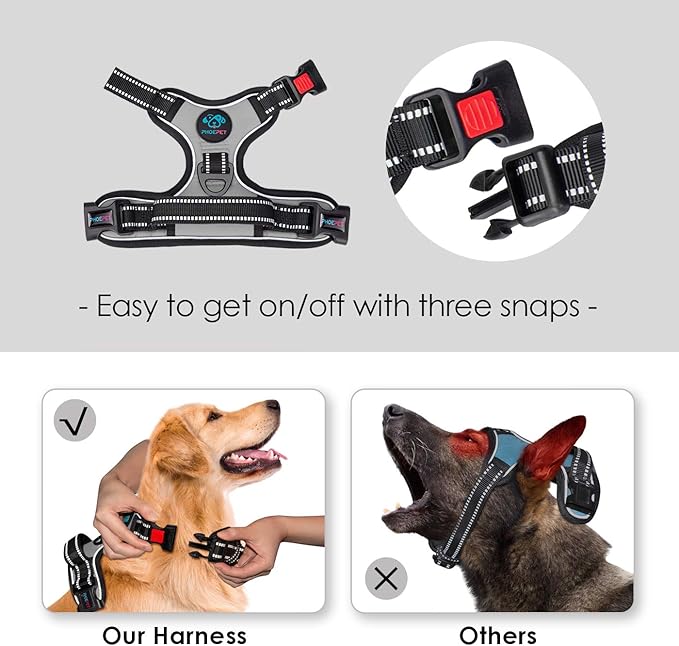 - [UPDATED VESION, EASY TO PUT ON & TAKE OFF] This dog harness has 3 buckles( One is on the neck with Lockable, two are on the chest), NO NEED go through dog’s head. This will let your dog loves to wear harness!