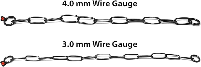 - Black Stainless Steel Long Link Fur Saver Collar: Wire Gauge 3mm thick by 21 inches (53cm) overall length for dogs with the neck size up to 18 inches; This collar works best for dogs up to 110 lbs (50kg)