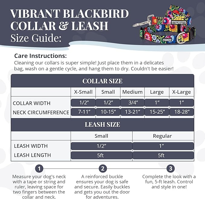 - DURABLE & UNIQUE DESIGN - Our sturdy, lightweight dog collar resists daily wear and tear while showcasing vibrant, unique, vivid, and stylish floral patterns that stand out on your dog. Additionally, the matching leash is 5 ft long and has a soft hand loop and D ring to attach keys or bag holders.