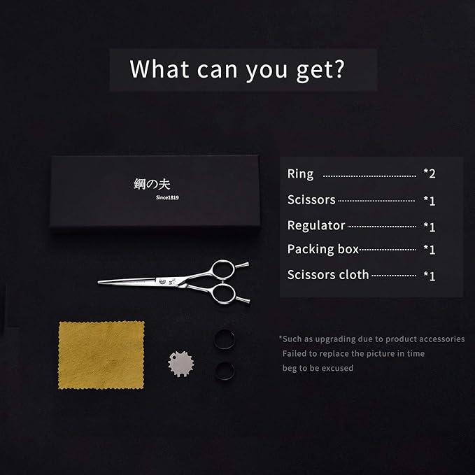 - PERFECT PRESENT - 1 X Hair Cutting Scissor, 2 X Ring, 1 X Regulator, 1 X Cloth, 1 X Exquisite Gift Box, 30-day unconditional return, and 365-day Warranty. If you have any problem with our Hair Scissors, please contact the seller to get a perfect solution. Warm Tips: Please do not open the scissors too much, which may make it difficult to close them again.(In normal use, it will not exceed 90 °, which is no problem)