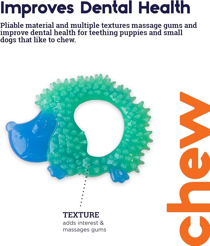 - Textures of this hedgehog chew toy help massage gums and add interest to keep your dog busy