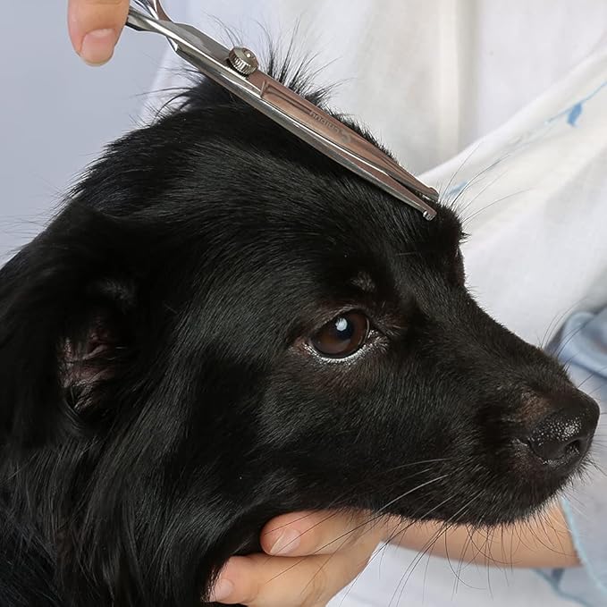 - 【 ADJUSTABLE AND SILENCER DESIGN】Pet grooming Scissors tool for dogs and cats. Can tightness of the blade can be adjusted by tightening or loosening the screw in the middle of the dog scissors according to the thickness of the pet hair for easy use. There is also a silencer pad on the handle, Can provide quiet grooming for your cats or dogs, which makes your pet will not be as scared as electric clippers.