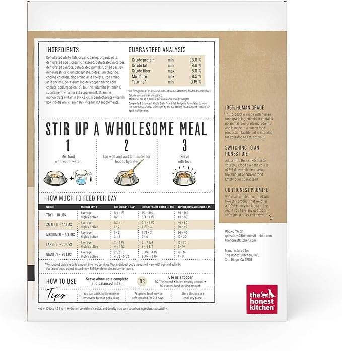 The Honest Kitchen Human Grade Dehydrated Whole Grain Dog Food – Complete Meal or Dog Food Topper – Fish 10 lb (makes 40 lbs) (Pack of 1)