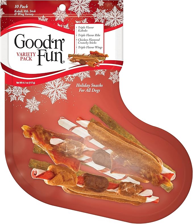 - VARIETY PACK: Contains an assortment of chews, including Good ‘n’ Fun Triple Flavor Wings, Triple Flavor Ribs, Triple Flavor Kabobs and Chicken Flavored Crunchy Sticks.