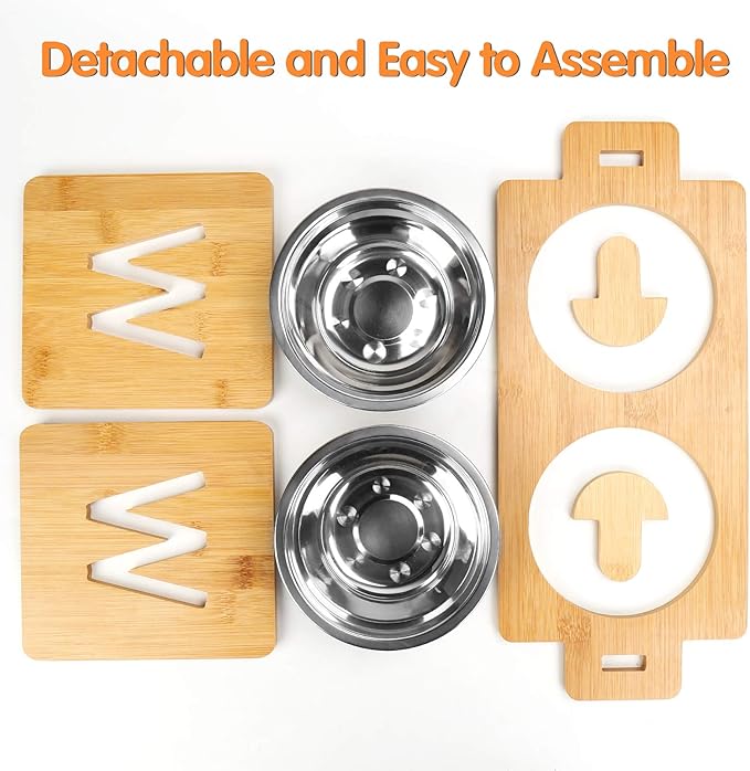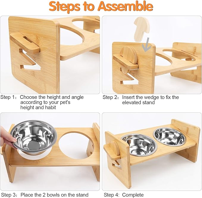 - Easy to Assemble: The stand is easy to install without tools, the 2 wooden corks, 3 wooden boards to build a feeding station, very easy and convenient. The 15 degree tilt angle of the stand meets the scientific perspective of small and medium dogs and cats