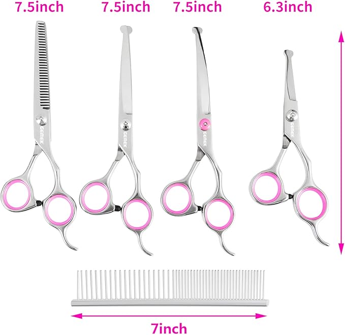 - ✔【Complete Home Pet Grooming Essentials Sets】5 pieces kit includes: 1* 7.0" grooming comb, 1* 7.5" thinning scissor, 1* 7.5" round tip curve scissor, 1* 7.5" round tip straight scissors, 1* 6.3" round tip straight edge scissors, 1 * cleaning cloth, 1 * black leather case.