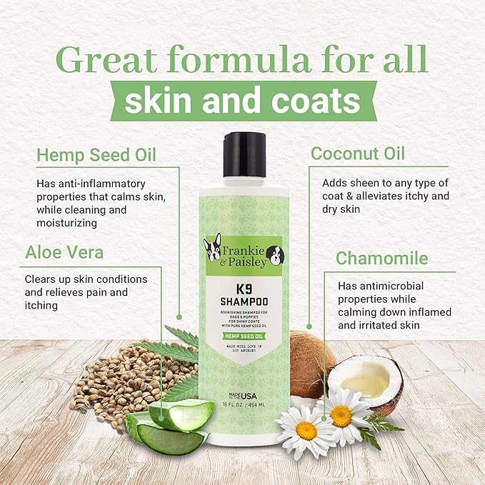 Frankie & Paisley Dog Shampoo for Allergies and Itching | Made with Plant-Based Hemp Seed Oil, Aloe, Coconut Oil | Puppy Shampoo for Sensitive Skin | Sulfate Free Shampoo and Paraben Free - 16 FL OZ
