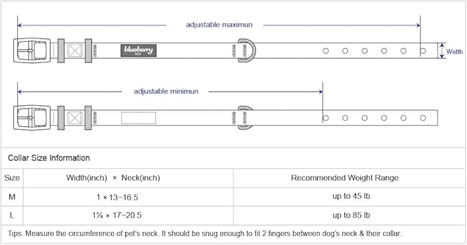 - Neck 17"-20.5", Width 1 1/4"; The collar does not stretch itself, please make sure leave ONLY 2 fingers between collar and dog neck. A properly fitting collar and harness won't leave any room for your dog to chew