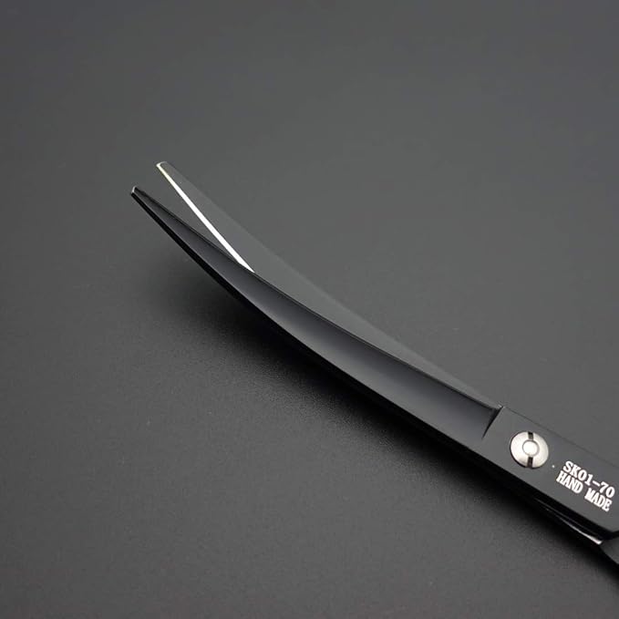 - SHARP EDGE. The edge line of the blade is evenly polished,which make the scissors durably sharp.With meticulously crafted clear tip of tooth ,the thinning scissors are sharp and do not clip the hair.The edge of the curved scissors is 25°-30°,majority standard angle to satisfy most part of groomers.