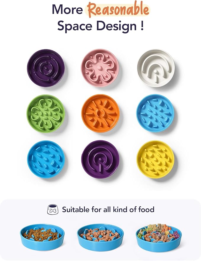 - Slow Down Eating, Bring Dog A Healthy Diet: Fast-eating dogs experience bloat, regurgitation, and obesity easily. Our slow feeder dog bowl design with the ridges and maze pattern helps your dog to eat slower than 26 times. Your dog could change his overeating behavior through a challenge and fun mealtime