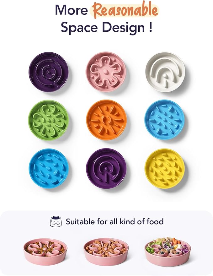 - Slow Down Eating, Bring Dog A Healthy Diet: Fast-eating dogs experience bloat, regurgitation, and obesity easily. Our slow feeder dog bowl design with the ridges and maze pattern helps your dog to eat slower than 51 times. Your dog could change his overeating behavior through a challenge and fun mealtime