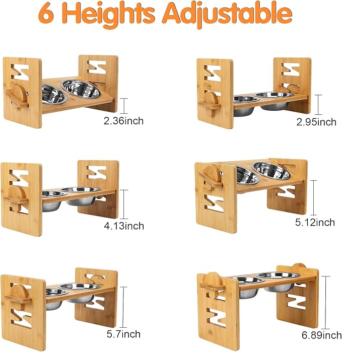 - Upgraded 6 Adjustable Heights: With the double N-shape design, there are 6 adjustable heights of flat and titled angles available to adjust from 2.4" to 6.9" high for your pets. You can adjust the height of the enhanced pet bowl according to dog's height and habit