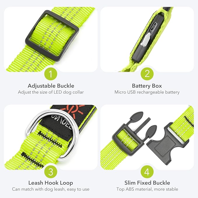 - 🐾 The LIGHTWEIGHT & COMFORTABLE design of this lighted pet collar makes it perfect for dogs to wear all day long. Made with 100% soft nylon materials that are breathable and flexible, it can also be used as a basic collar.