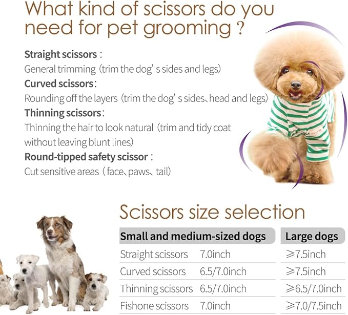 - 🐶[Great Gift Idea] The grooming shears are ideal for a pet hospital, pet salons, and family to use on dogs, cats, and so on. You can become a professional pet groomer at home, Saving Time and Money, More is make you enjoy the feeling of taking care of your four-legged family member. The dog trimming scissors for grooming is also definitely the perfect gift for relatives and friends, especially for dog or cat lovers.