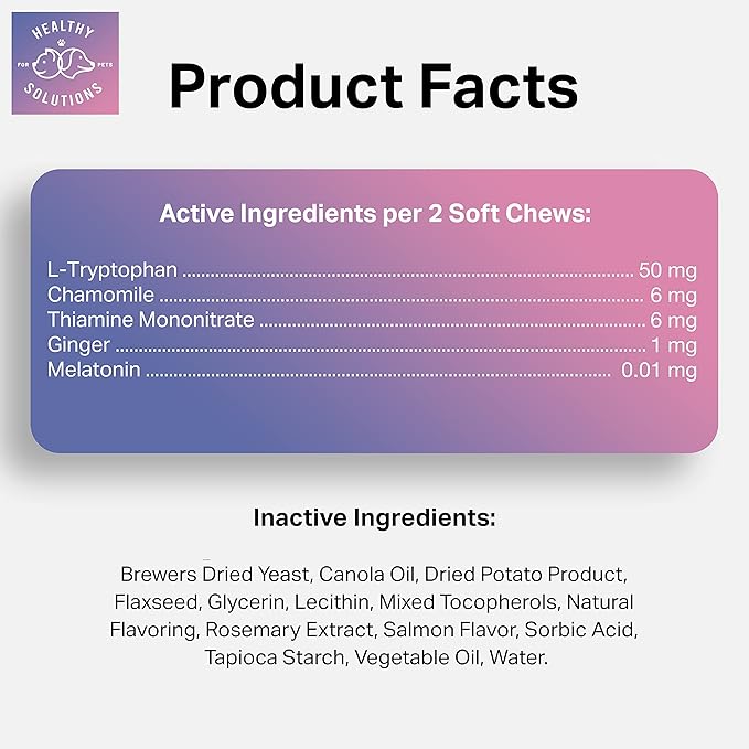 • 🗸 VETERINARIAN FORMULATED -- with Melatonin, Chamomile, Passion Flower, Thiamine, L-Tryptophan, and Ginger to help soothe sensitive stomaches.