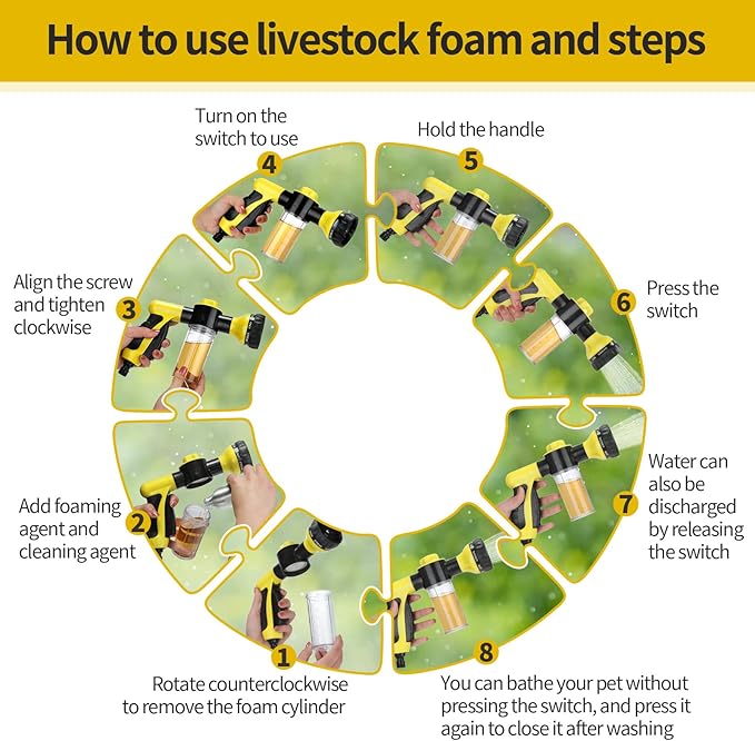 - Using method: wash your pets in five minute to gain a better cleaning effects; Just put desired foam shampoo to the container bottle, spray the foam on pets' body, give them a comfy massage, then rinse the foam off; For obtaining a better cleaning effect, please do not pre-wet your pets before using, because pre-wetting will interfere with the performance and reduce the shampoo's effectiveness; This pet bathing tool is suitable for most kinds of pets
