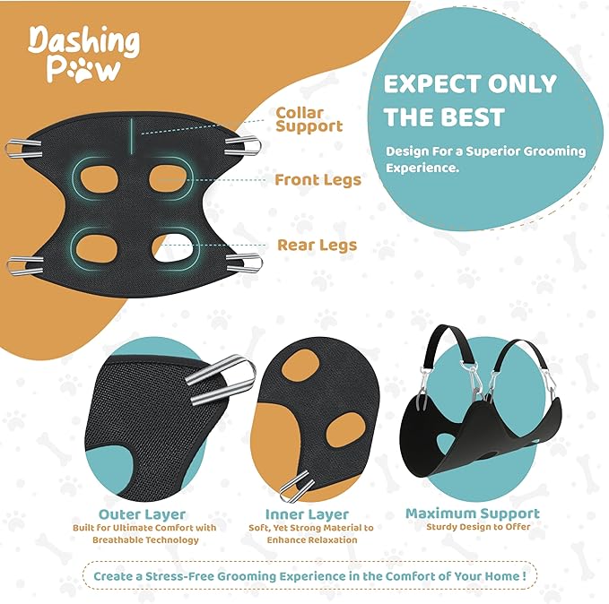 - THE LAST THING YOU NEED IS A FLIMSY DOG SLING with weak, unsecured S hooks that put your best fur-friend at RISK OF FALLING. At Dashing Paw, your dog’s safety is our #1 priority. Our dog grooming sling features innovative, locking CARABINER ATTACHMENT HOOKS that provide LONG-LASTING SUPPORT for even large dogs. We then reinforce our dog sling for nail clipping with STRONG, DURABLE STRAPS for maximum STRENGTH & RELIABILITY.