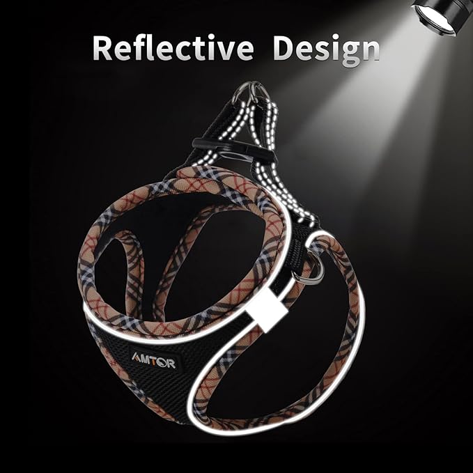 - Reflective dog harness - AMTOR small dog harness with Magic Tape,buckle and double D-rings work together protect your pet in three layers of security. The 360° highly reflective strips provide good visibility in the dark