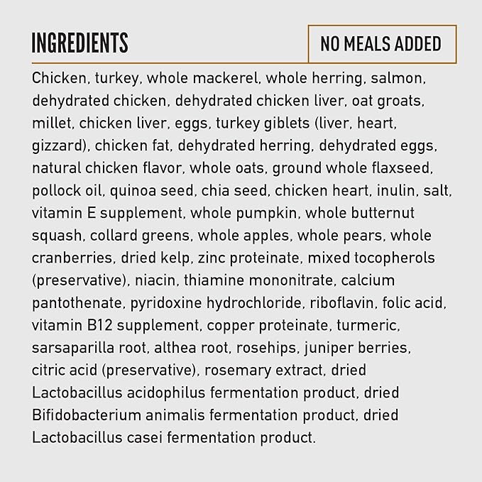 - The first five ingredients are fresh or raw chicken, turkey, whole herring, whole mackerel and salmon to provide your dog with essential protein, vitamins and minerals, as well as grains sourced from non-GMO crops
