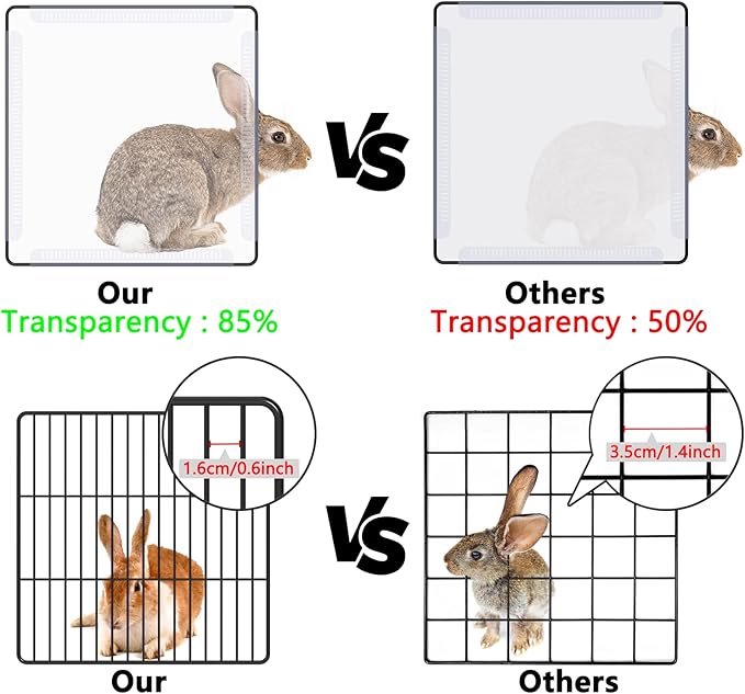 - Iron-Plastic Combination, Visualization: Clear plastic panels and iron mesh panels maintain sufficient visualization, you can see and interact with your rabbits, guinea pigs, hedgehogs, puppies, hamsters, ferrets, turtles, etc. at any time; Plastic panel of pet playpen is easy to clean and beautiful; the iron mesh panel is located on the lower layer, which is ventilated and prevents pets from chewing.