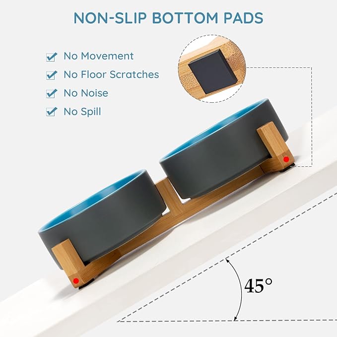 SPUNKYJUNKY Ceramic Dog and Cat Bowl Set with Wooden Stand, Modern Cute Weighted Food Water Set for Small Size Dogs (13.5OZ) & Medium Sized Dogs (28.7OZ) & Cats (1.7 Cups, 2 × Blue-Grey)