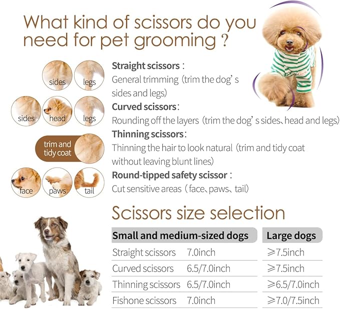 - 🐶[Application] 7 inch curved chunker scissors are particularly handy for shaping teddy bear heads, poodle pom-poms, round feet, round tails and ears, as well as the inside of the back legs when used with the curve facing away from the dog. Curves thinner shears tend to quickly become favourites once you get used to them.These grooming scissors are suitable for pets over 11.8 inch/30cm in length.