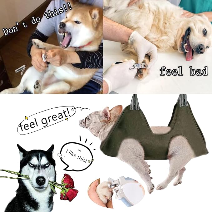 - 🐕🦺【Good helper for pets】This dog grooming hammock is the perfect tool to comfortably restrain your dog for a stress-free grooming session. Even at home, you can easily accomplish the same things like the pet hospital grooming table. This dog grooming hammock harness makes it easier to trim nails, take medicine, clean teeth and ears, and use eye drops without worrying about injury.Besides, dog grooming harness is also a good helper for veterinarians.