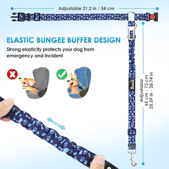 SlowTon Dog Seat Belt for Car, 2 Pack Dog Car Harness Seatbelt Adjustable with Elastic Bungee Buffer, 2 in 1 Pet Car Leash Headrest Restraint Dog Reflective Safety Tether (Blue Paw, Headrest+Clip)