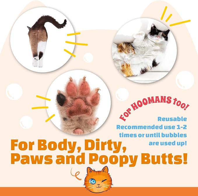 - NON-TOXIC, LICK-FRIENDLY - Our non-toxic, cat dry wash shampoo is SULFATE-FREE, FORMALDEHYDE-FREE, PHTHALATE-FREE, ALCOHOL-FREE, and DYE-FREE. Our rinse-free, cat wash cloth allows you to bathe your furry one without the stress of water while letting your pet groom themselves safely!
