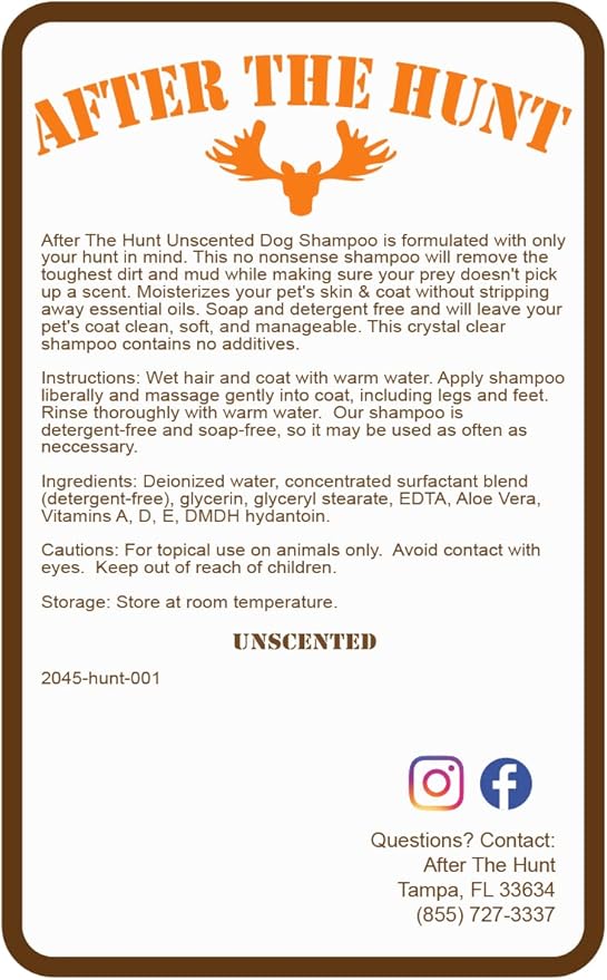 After The Hunt Unscented Dog Shampoo Fragrance Free with No Scent for Hunting 8 oz