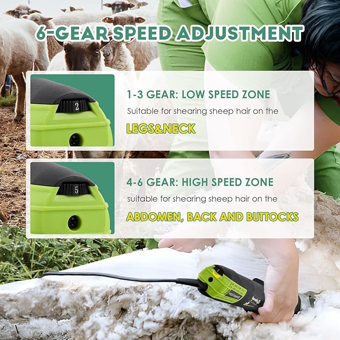 - 6 SPEED REGULATION- The sheep shear is with 6 variable speed adjustment knob to regulate speed according to your demand and requirements as well as your familiarity with the operation. Generally speaking, those body parts of sheep such as neck and legs require 1-3 gear when shearing, while back, abdomen and buttocks need 4-6 gear.