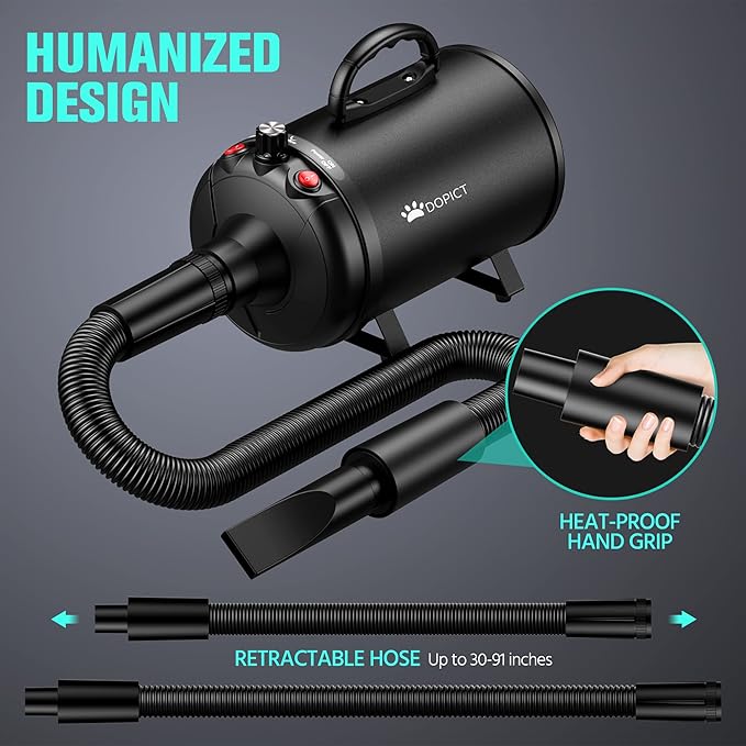- STRONG AND STABLE MOTOR: Dog grooming dryer with Equipped with strong and stable motor, provide several speed and temperature. The temperature and air flow of the blower can be controlled by turning the temperature and wind button. Wind Speed: Max.72m/s; Temperature: 95℉-135℉(35℃-60℃); For your different grooming needs, also it can be used for dry your car, floors and furniture.