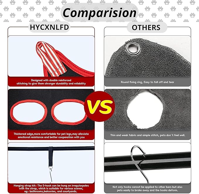 - 【Comfortable Fabric】 The dog nail hammock is built of a double-layer fabric design, with the outside layer using 3D air-mesh technology and the inside layer using high-density knitted material. High-density knitted sling design improves security by preventing pet falls. In addition, our carabiners are sturdier and safer than other S-shaped hooks since they won't distort or break your dog hammock for grooming.