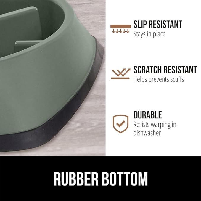 - RUBBER BOTTOM: the slow feeder bowl’s nonslip, scratch resistant, rubber bottom curves around the entire base of the bowl, helping to keep it in place on your floors; eager eaters may slightly move bowl while eating, pair with the Gorilla Grip Pet Feeding Mat