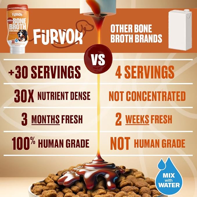 - Enhance Mealtime Joy: Treat your furry friend to the rich flavor and wholesome goodness of Furvor Chicken Bone Broth for Dogs, a delectable addition to their daily diet. Only all natural ingredients, free from gluten, soy, eggs, dairy, and nuts are used. No worries about giving your dog any artificial color, flavors, or preservatives.