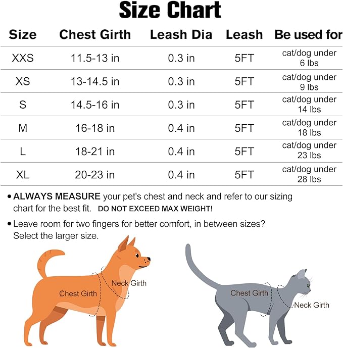 - 🐶XXS Dog Harness and Leash---Chest Girth 11.5" - 13", Leash Dia: 0.3" (0.8CM), Length: 5FT (150CM). The thickness of the leash fit for small dogs and puppies, light and easy to handle. Our halter is escape-proof with correct sizing and snug fit. NOTE: Sizing does NOT directly correspond to your pet's breed or weight. Pls MEASURE your pet's chest (full part) girth before purchase. If in between sizes, please order one size up, feel free to contact us if you have any questions about the size.