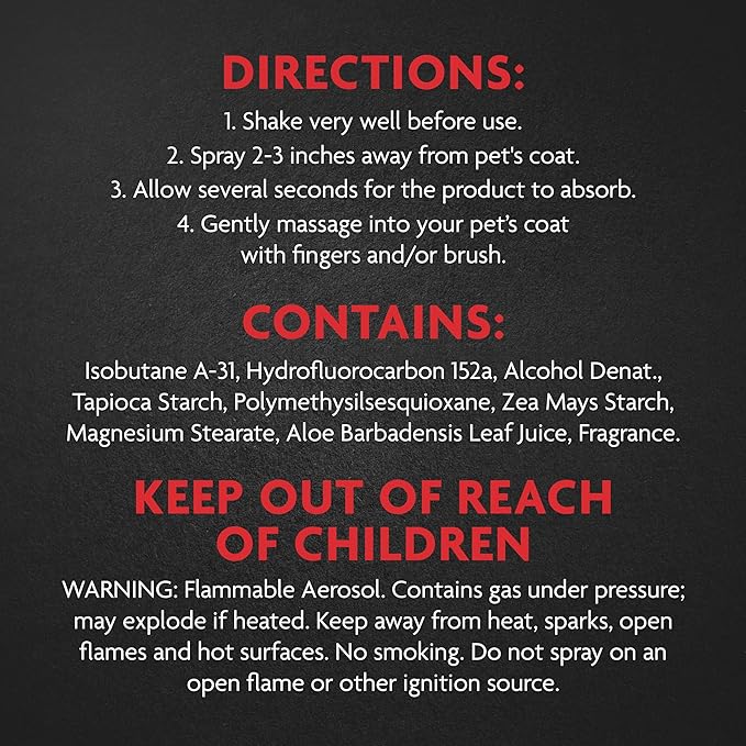 - DRY SHAMPOO FOR DOGS: Freshens pet’s coat with a light fragrance between baths—no water needed!