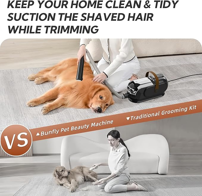 - 【Low Noise Technology】Bunfly adopts the latest noise reduction technology, the noise is only 65dBA, effectively protecting pets' sensitive hearing. Novice pets can adapt slowly from the first gear.We suggest grooming your pet with our brush before trimming pet hair, treating your pet with little snacks to avoid making your pet nervous because of vacuuming noise, which conclusively makes the grooming experience even more enjoyable.