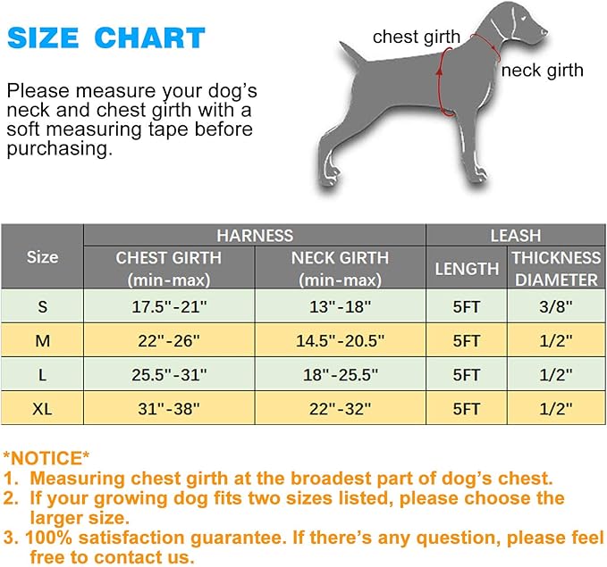 - 【 EASY TO USE AND LOCKING SECURITY 】The dog harness with simple design and quick snap buckles which make it easy to put on and take off. Locking feature on both snaps makes it more secure, 100% ensures no accidentally detachment. 4 easy size adjustors at neck and chest for easy adjusting to fit your dog perfectly, even with some room of growth. Perfect for daily walking, running, hiking, training, hunting, outdoor adventure and more!